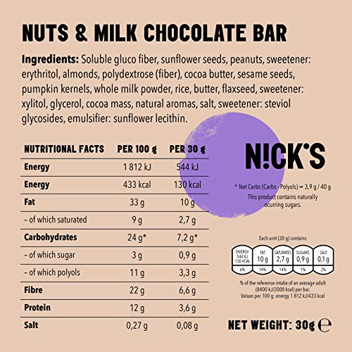 Specificaties: NICKS Go Nuts Milk Chocolade, zaden & notenrepen met melkchocolade, zonder toegevoegde suikers, glutenvrij | 12x30g